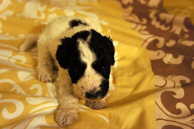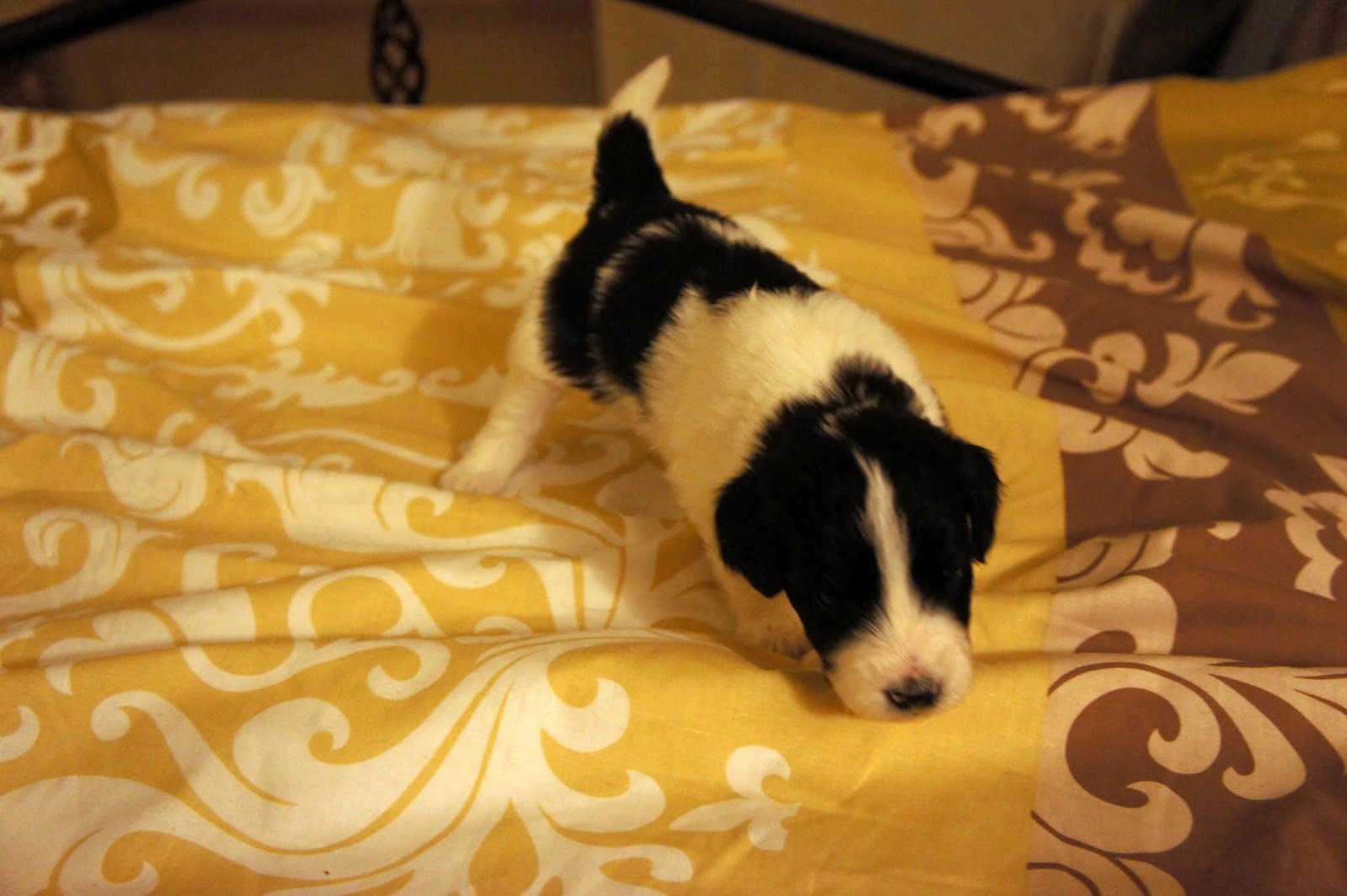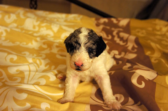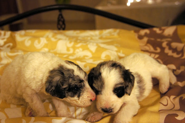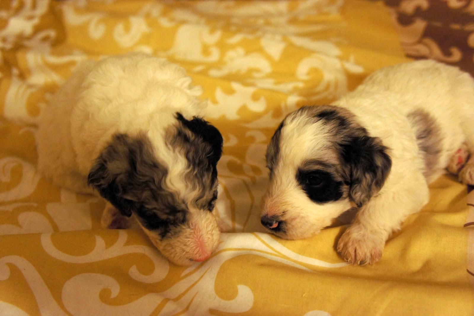 We have 4 male puppies.This one has been taken.  Two of the male puppies we think are twins and in several weeks will be old enough  to have DNA tests. We are not sure if we will separate them. But if we do the lovely young woman who chose this pup will have first choice of one of the twins. The twins are meryls and have one blue eye