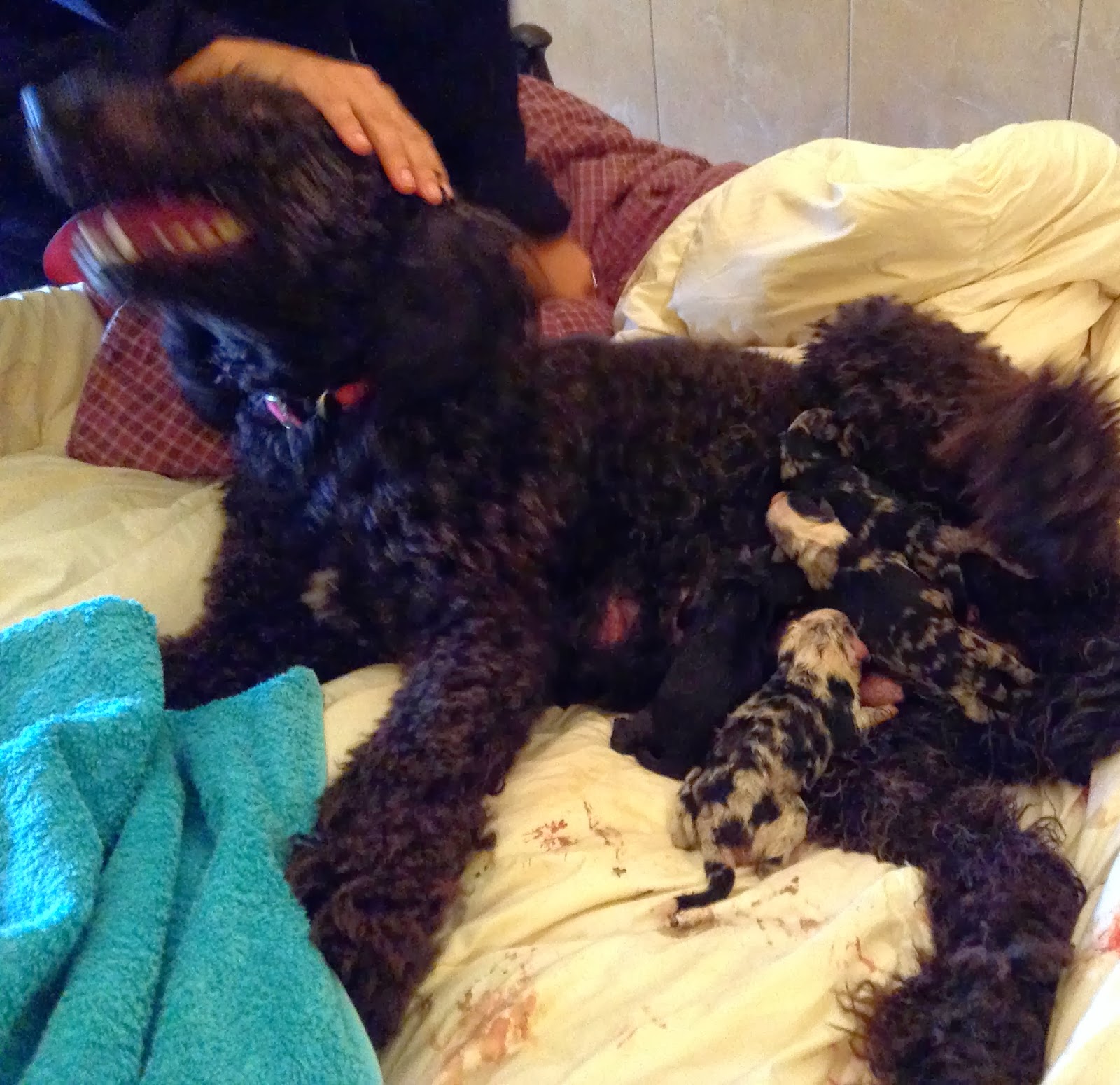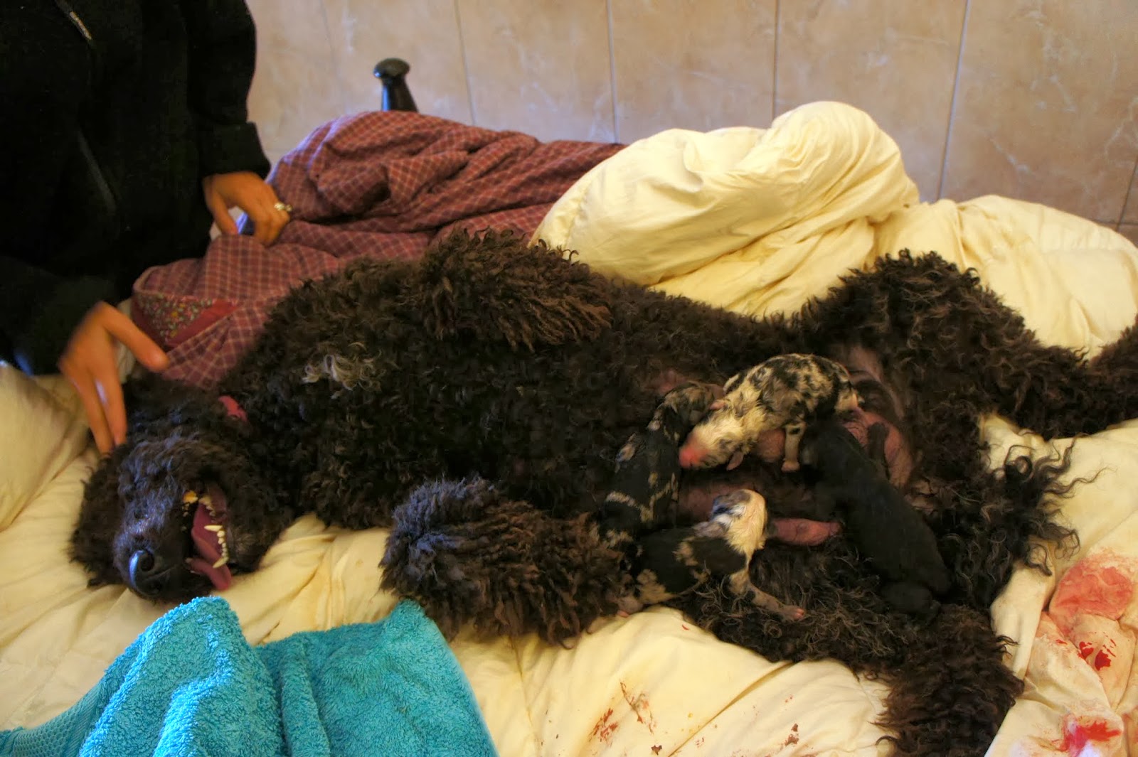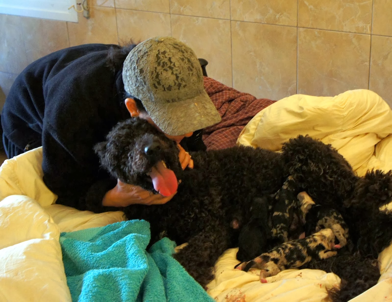 Molly, from Molly's first litter delivers her pups with her owner, Lori. So far, 7 pups